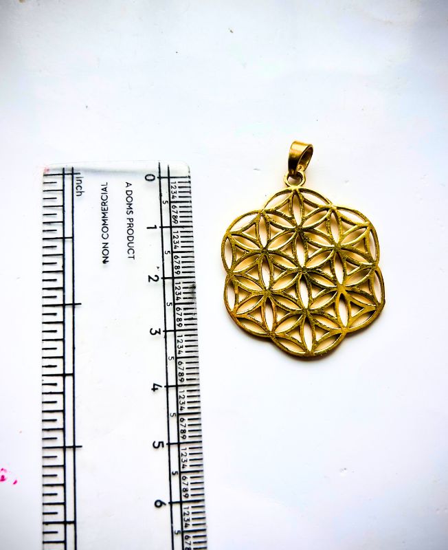 A bold brass pendant featuring the timeless Flower of Life pattern, known for its symbolic geometry and spiritual significance.