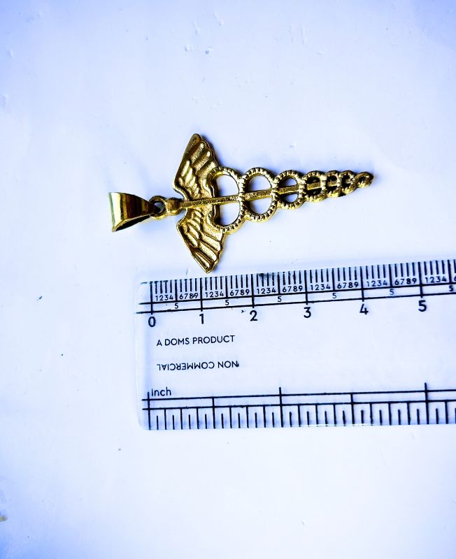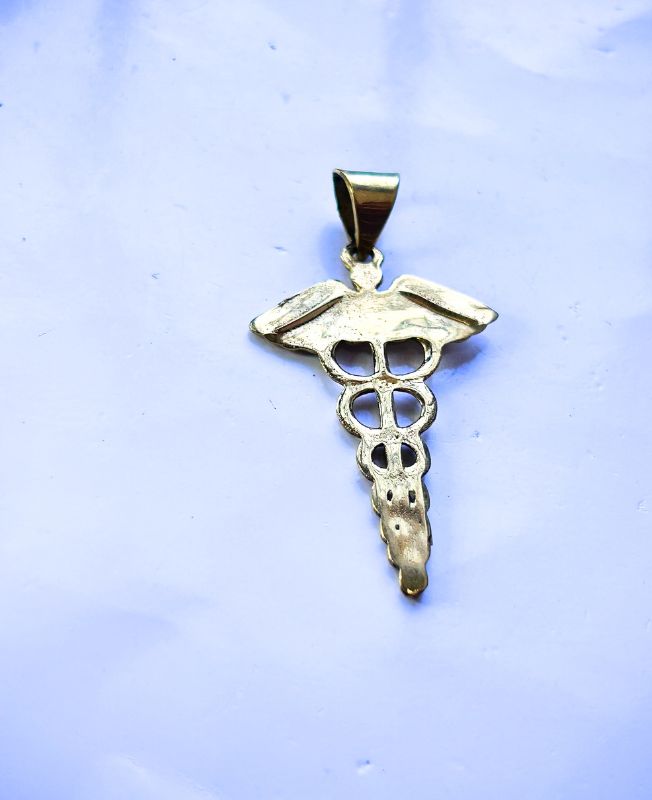 Unique handmade brass pendant featuring the Caduceus symbol with detailed wing and spine design. Ideal for medical professionals or as a healing symbol accessory.
