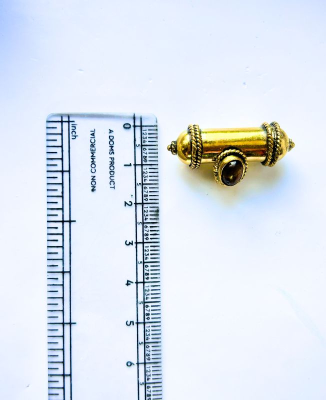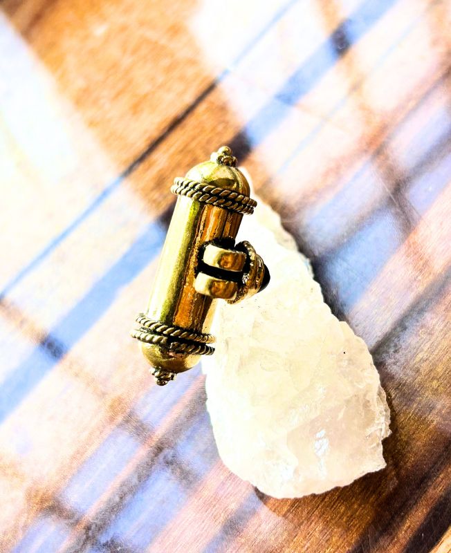 Intricately crafted cylindrical brass amulet pendant with ornate end caps and central gemstone detail. Unique spiritual design and vintage charm.