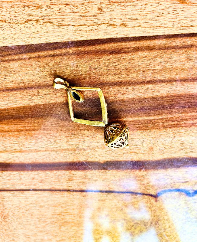 This vintage-inspired brass pendant combines bold geometry with intricate metalwork. The upper section showcases a marquise-cut black stone set into a stylized diamond-shaped frame with delicate engravings on each side. Dangling from the frame is a beautifully detailed filigree orb with a hollow structure, adding movement and charm to the piece.