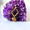 Vintage-style brass pendant featuring a geometric diamond frame, black marquise-cut stone, and an ornate hollow orb drop. Elegant and eye-catching.