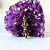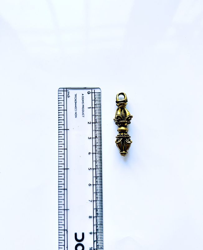 This vintage-style brass pendant represents the Vajra or Dorje, a powerful spiritual symbol in Tibetan Buddhism that signifies indestructibility and spiritual strength. The double-ended design mirrors traditional ritual objects used in meditation and ceremony. Compact and detailed, this pendant is ideal for spiritual jewelry pieces or talismans. Its antique brass finish gives it an earthy and authentic feel, while the loop at the top makes it easy to incorporate into necklaces or keychains.