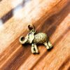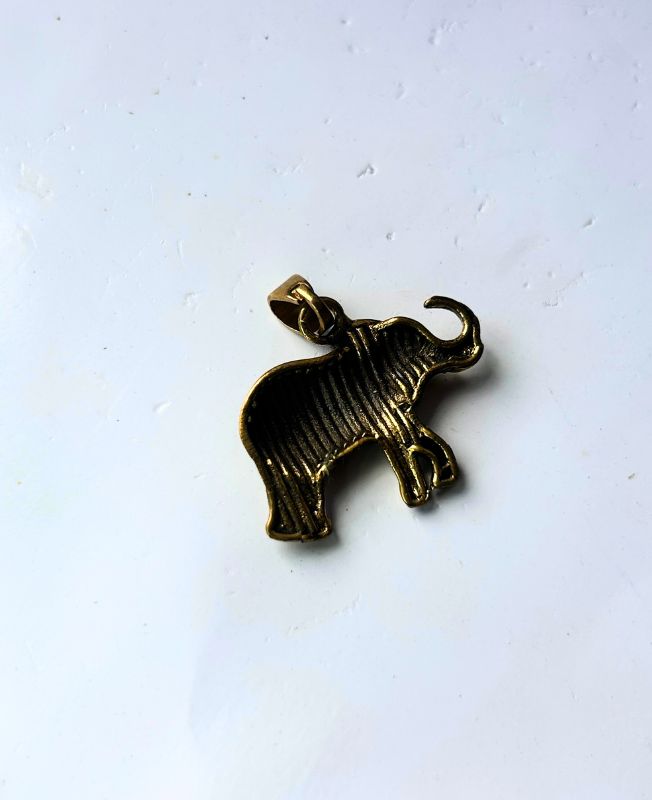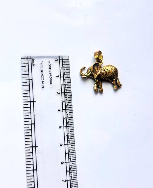Detailed elephant-shaped brass pendant with engraved patterns and antique golden finish, symbolizing wisdom and strength.