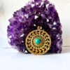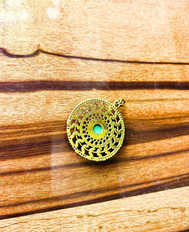 Round brass filigree pendant with an intricate openwork spiral design centered by a turquoise gemstone. A bohemian and spiritual piece that captures timeless elegance.