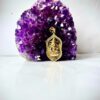 This ornate brass pendant showcases a finely detailed depiction of Lord Ganesha, the Hindu deity of wisdom and new beginnings. The design is framed within a shield-like border that adds both structure and symbolism. The pendant has a rich, antique finish, making it perfect for spiritual-inspired macramé necklaces, mala beads, or statement pieces. The pendant is slightly domed and textured for added dimension.