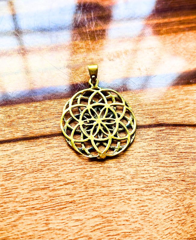This large round brass pendant showcases a beautifully symmetrical flower-of-life-inspired design, built in layered openwork geometry. The overlapping petal structure creates a multi-dimensional, lace-like effect that catches light and draws the eye. Made from polished raw brass, it features a warm, golden tone that adds both elegance and a handmade artisan feel.