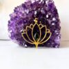 Elegant lotus flower brass pendant featuring a central black gemstone cabochon, symbolizing purity and spiritual awakening.