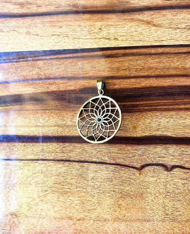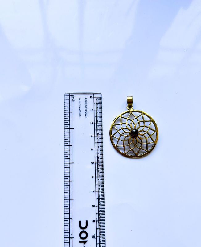 This stunning brass pendant features a symmetrical mandala flower design with intricate openwork detailing. At its center lies a small dark gemstone that adds a touch of depth and contrast to the golden brass tone. The circular pattern represents unity and inner peace, making it a beautiful piece for meditation jewelry or everyday wear.