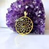 Elegant round brass pendant with a mandala-inspired flower pattern and a small dark gemstone centerpiece, symbolizing harmony and spiritual balance.