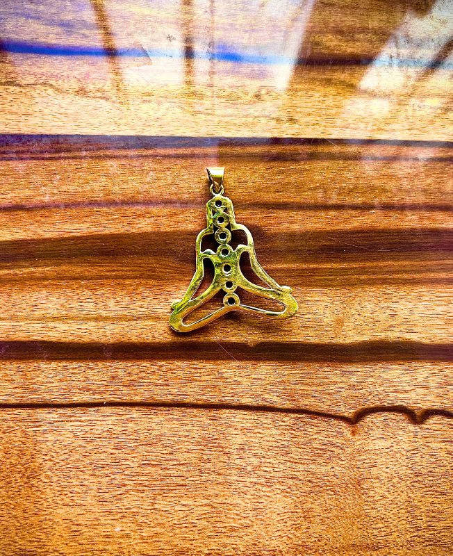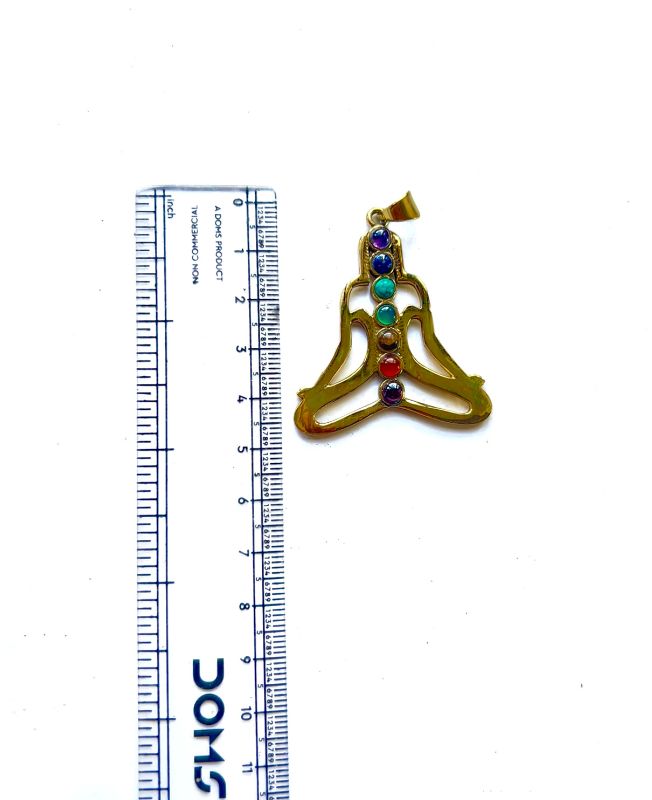 This beautiful brass pendant depicts a seated meditating figure, with each chakra represented by a colorful stone in ascending order. The open-frame design allows light and air to flow through, evoking peace and breath. Ideal for spiritual jewelry collections, yoga lovers, and conscious fashion designs.