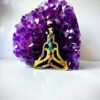 This beautiful brass pendant depicts a seated meditating figure, with each chakra represented by a colorful stone in ascending order. The open-frame design allows light and air to flow through, evoking peace and breath. Ideal for spiritual jewelry collections, yoga lovers, and conscious fashion designs.
