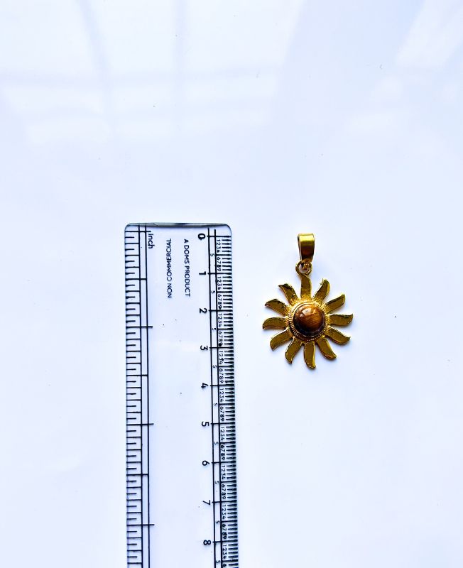 This delicate brass pendant captures the warmth and brilliance of the sun with its bold, sculptural design. Crafted in a compact yet detailed form, the pendant features a central domed circle surrounded by eleven flared rays, giving it a sense of motion and energy. The rich golden brass has been polished to a soft shine, while the raised center adds depth and dimension. Measuring just over 4 cm in height including the bail, this piece is perfect for minimalist boho jewelry, spiritual talismans, or layered charm necklaces. The lightweight construction makes it ideal for everyday wear or incorporation into custom designs.