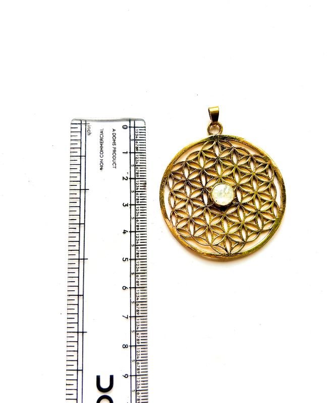 This intricately crafted brass pendant showcases the ancient Flower of Life pattern, a symbol revered across cultures for its geometric perfection and metaphysical meaning. At the center of the design lies a luminous round cabochon-style gemstone, creating a beautiful focal point that enhances the spiritual resonance of the piece. The pendant is polished with a warm antique-gold tone, giving it a timeless and elegant appearance.