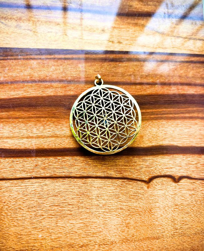 Round brass pendant featuring the sacred Flower of Life pattern with a raised center cabochon, symbolizing unity and harmony. Ideal for spiritual jewelry collections or statement pieces.
