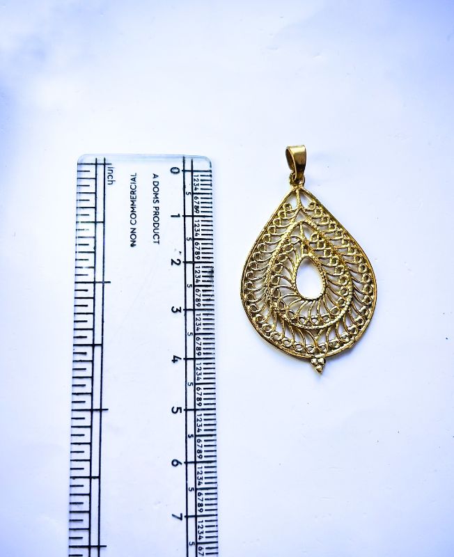 This large teardrop-shaped brass pendant showcases traditional filigree craftsmanship with a symmetrical, lace-like pattern and a hollow center. The fine wirework forms nested layers of ornate loops within a bold teardrop frame, offering a lightweight yet visually impactful design.