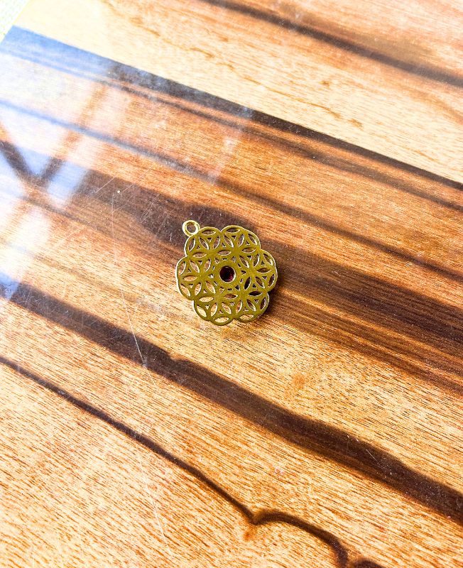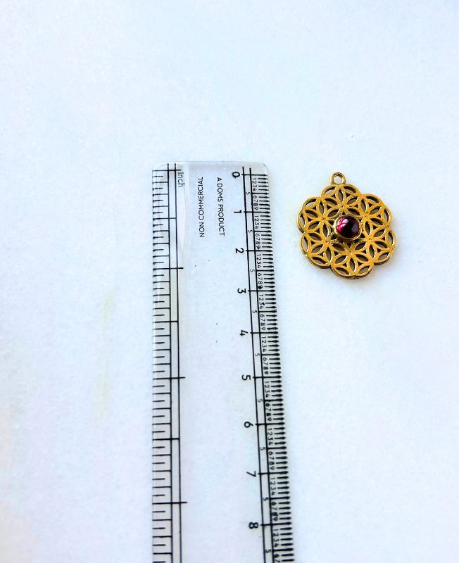 This intricate brass pendant showcases the timeless Flower of Life symbol, representing the interconnectedness of all living things and the balance of creation. At its center lies a deep red gemstone, adding a touch of vibrant energy and elegance. Handcrafted with fine detailing, this piece blends ancient symbolism with modern bohemian charm. Ideal for meditation, spiritual jewelry collections, or as a statement necklace centerpiece.