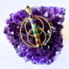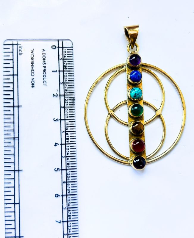 A powerful brass pendant featuring sacred geometry and seven vibrant chakra stones aligned in a vertical row. The overlapping double circle design adds symmetry and balance, making it a stunning metaphysical accessory.