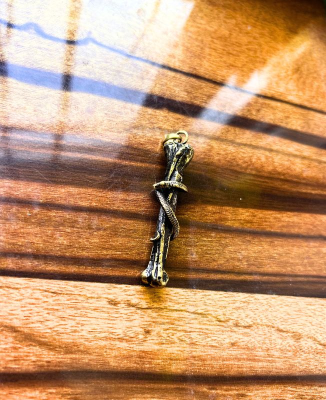 Antique-finish brass pendant featuring a serpent coiled around a stylized bone, symbolizing transformation and rebirth.