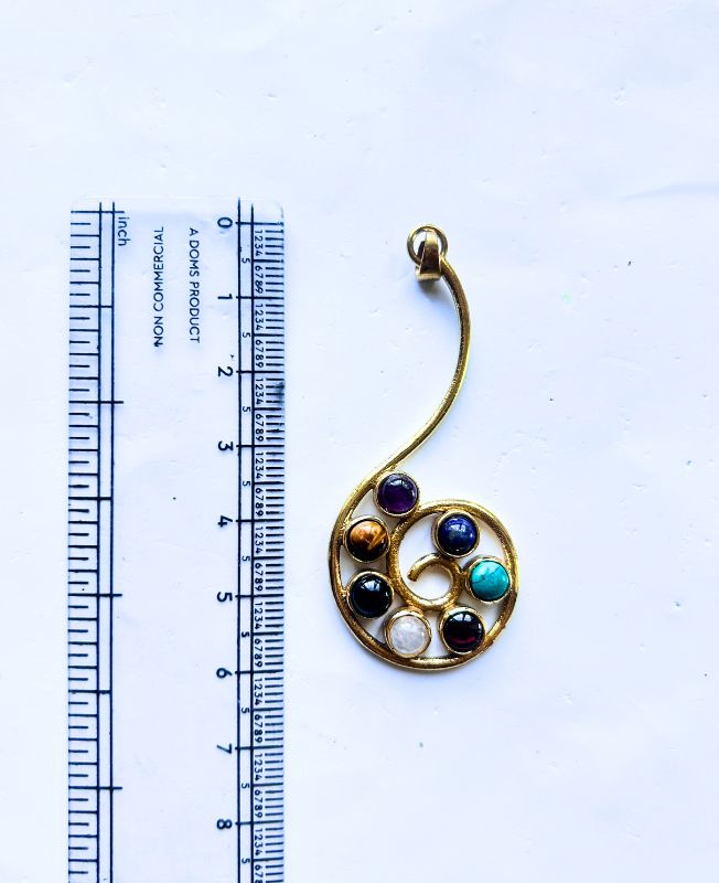 A stunning handmade brass pendant featuring seven chakra stones arranged in a spiral swirl pattern. This boho-inspired piece is a beautiful representation of harmony, energy, and spiritual balance.