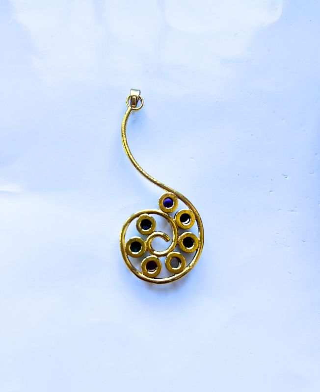 This exquisite brass pendant showcases a unique spiral design that gracefully holds seven polished chakra stones, each representing one of the seven energy centers in the body. Carefully crafted in brass, the pendant carries an earthy golden tone and artisanal character.