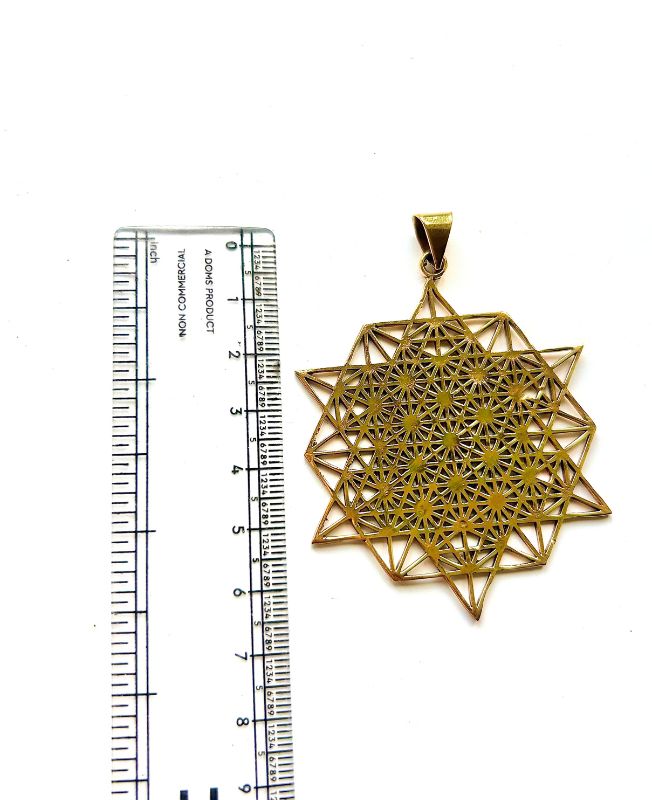 This stunning pendant showcases a sacred geometry design with a twelve-pointed layered star, echoing the cosmic patterns of harmony and balance. Crafted from raw brass, it offers a warm golden hue and crisp detailing that complements bohemian or spiritual jewelry designs.