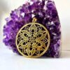 A stunning round brass mandala pendant featuring a filigree lotus design with petal-like geometry. Perfect for macrame necklaces or as a centerpiece in bold jewelry creations.
