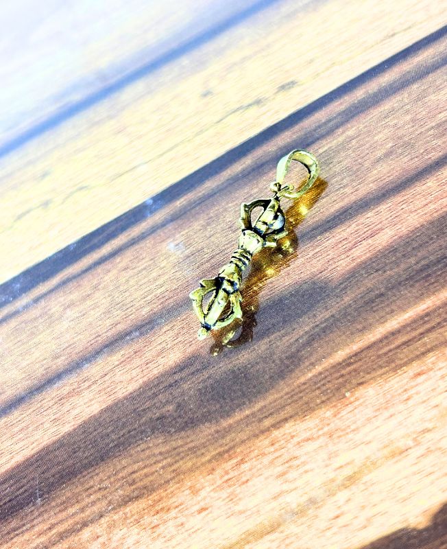 This intricately crafted small Vajra pendant is made from polished brass, representing the symbolic thunderbolt of Tibetan Buddhism. The Vajra is known for signifying strength, protection, and the indestructible nature of truth. This piece features fine detailing on both ends and a solid central core, reflecting the dual energy of compassion and wisdom.