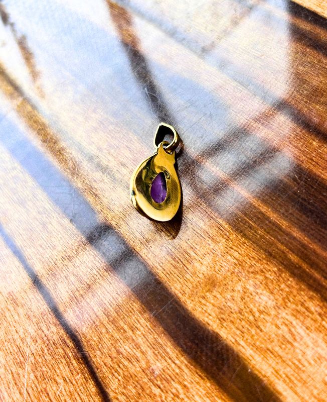Elegant brass teardrop pendant featuring a polished black stone at the center, bordered by detailed handcrafted patterns that enhance its timeless charm.