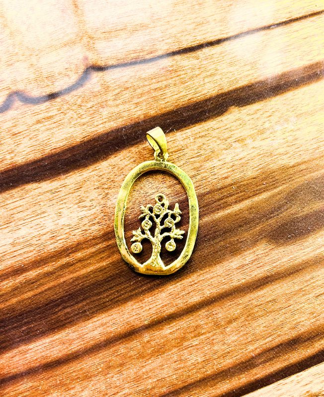 Intricately crafted brass pendant featuring a symbolic Tree of Life within an oval frame, perfect for meaningful jewelry designs or spiritual accessories.