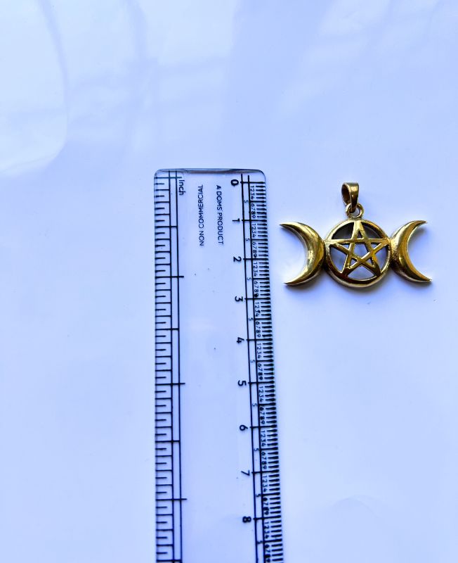 This handcrafted Brass Triple Moon Pentacle Pendant beautifully merges Wiccan symbolism with timeless brass artistry. The central pentacle signifies balance, protection, and the harmony of the five elements, while the waxing, full, and waning moon crescents embody the maiden, mother, and crone aspects of feminine power.