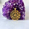 Elegant round brass pendant featuring the sacred Flower of Life design, symbolizing harmony, creation, and interconnectedness. Perfect for spiritual jewelry collections or boho-style accessories.