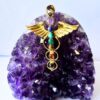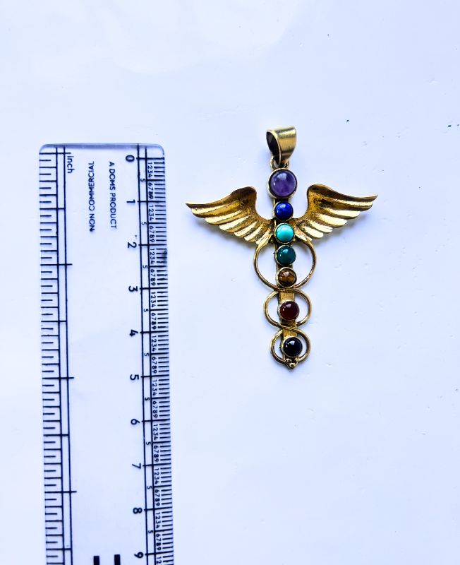 A beautifully crafted chakra healing pendant made from polished brass, featuring seven vibrant chakra stones aligned vertically along a winged caduceus motif, perfect for spiritual alignment and energy work.
