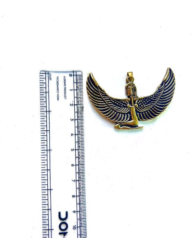 This striking brass pendant depicts the Egyptian goddess Isis in her classic winged form. With her arms and wings outstretched, the goddess symbolizes protection, divine femininity, and mystical power. The design is cast in warm antique-finish brass, offering both a vintage feel and modern versatility.