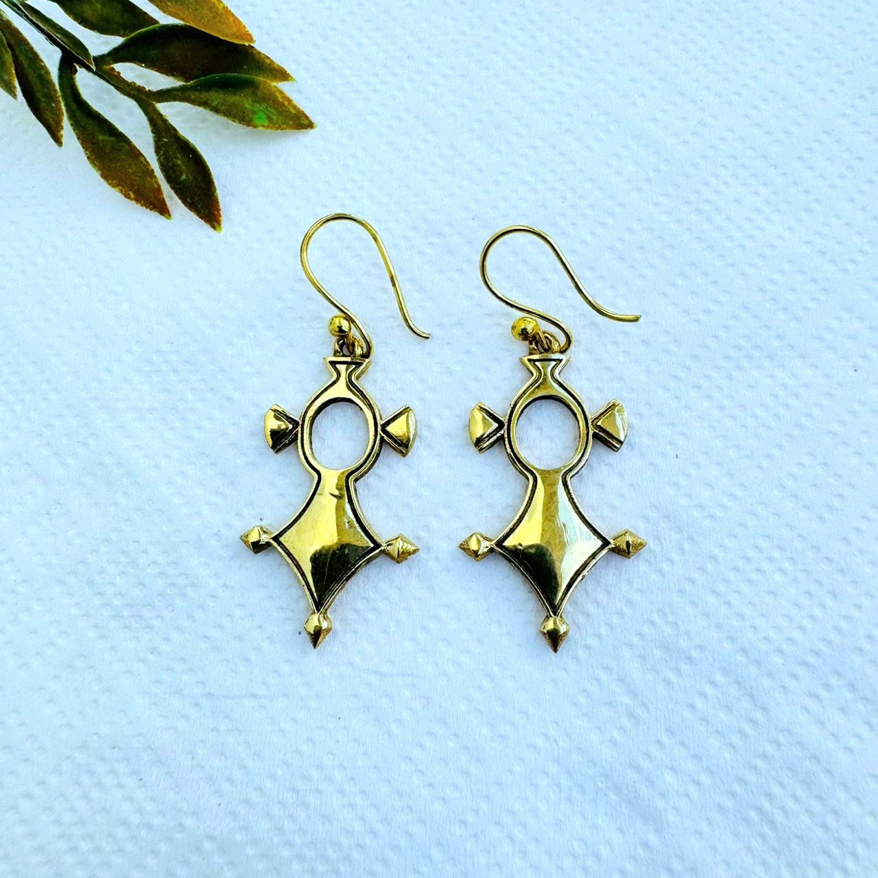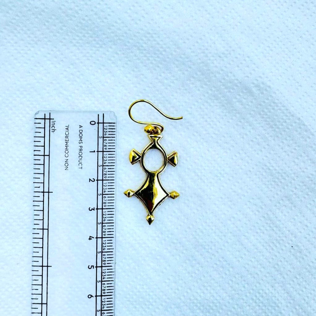 Handcrafted gold plated brass earring featuring a traditional geometric triangular silhouette inspired by Agadez Cross motif. Hand finished with geometric cut outs and pointed accents. Lightweight and perfect for a bold yet elegant look.
