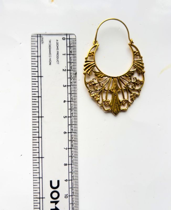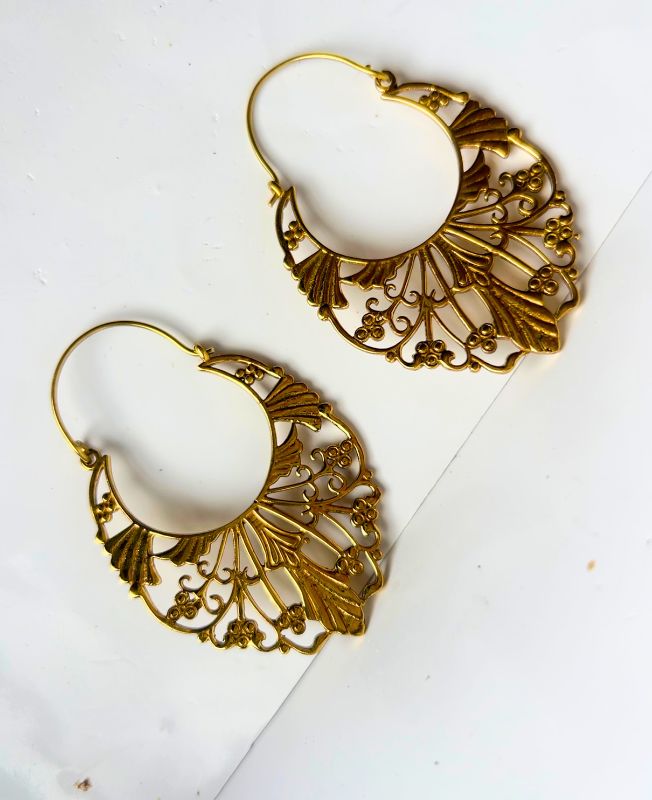An ornate, vintage-inspired brass hoop earring featuring intricate Art Deco filigree detailing and floral accents, perfect for statement boho-chic styles.