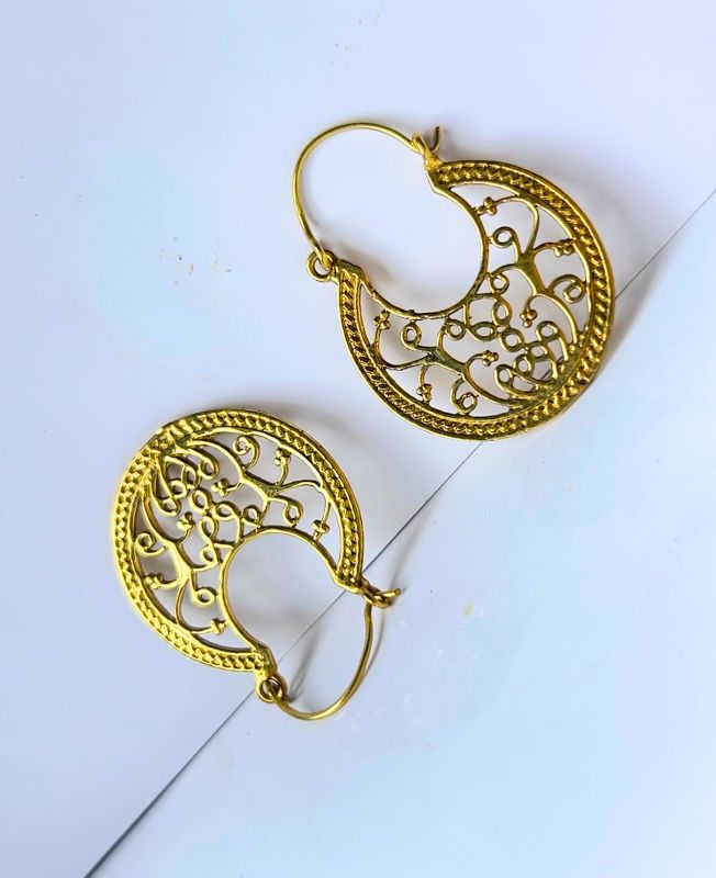 Delicate crescent-shaped hoop earrings in antique gold tone, featuring intricate filigree detailing inspired by traditional vintage designs.