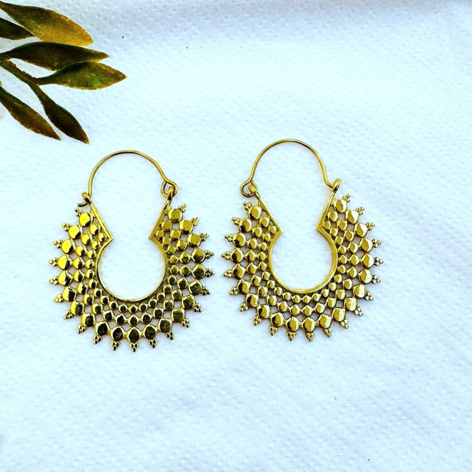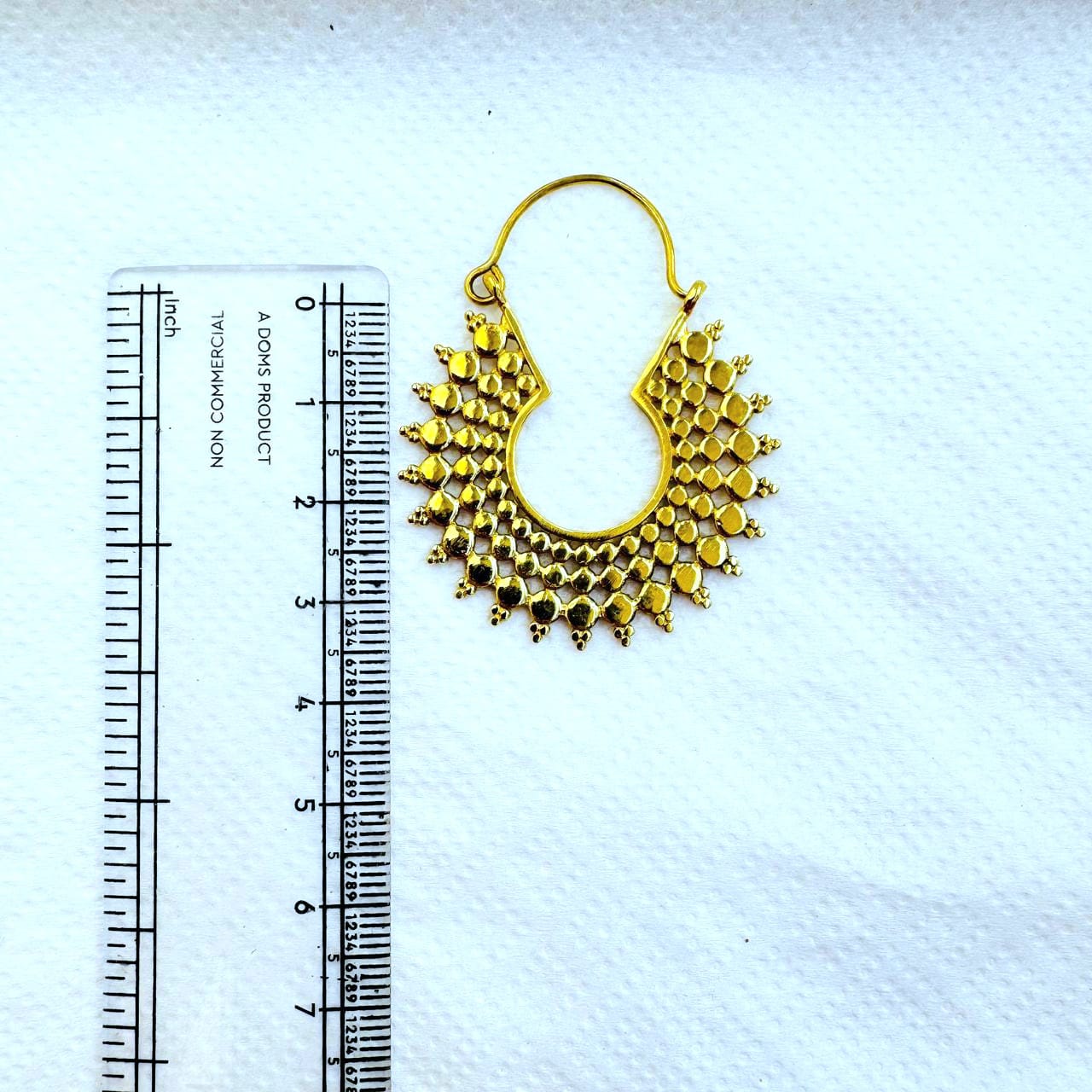 These statement brass hoop earrings feature an eye-catching arrangement of rounded brass beads, carefully assembled into a wide fan shape that radiates outward from the hoop. The dotted surface catches the light beautifully, creating depth, movement, and a luxurious golden glow.