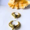 Elegant crescent-shaped brass earring with detailed beaded edging and central drop charm. Adds a refined ethnic flair to statement or everyday styles.