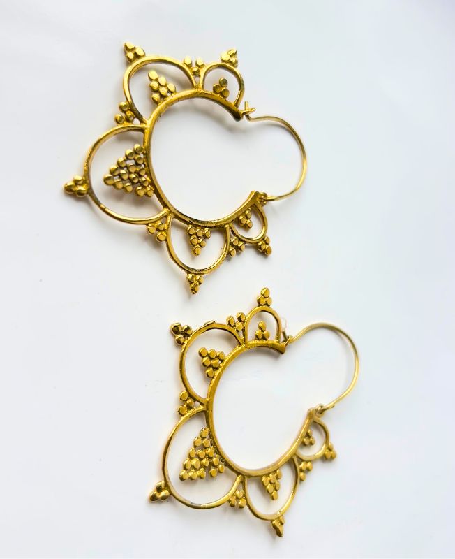 These handcrafted hoop earrings feature intricate grape-cluster-style detailing along a rounded floral frame. The antique gold tone adds a warm, vintage feel, while the scalloped silhouette makes them stand out for ethnic, tribal, or festival-inspired styling.