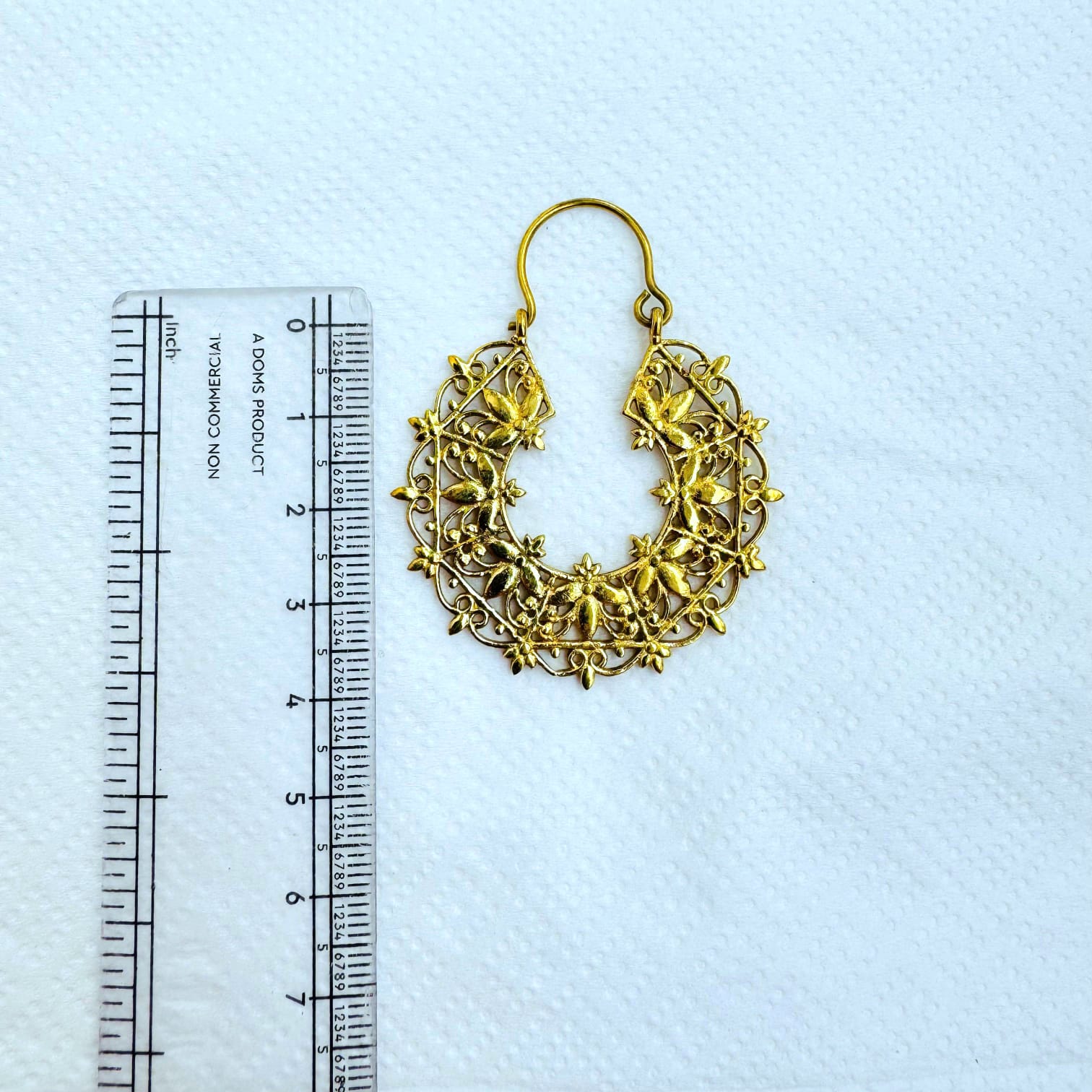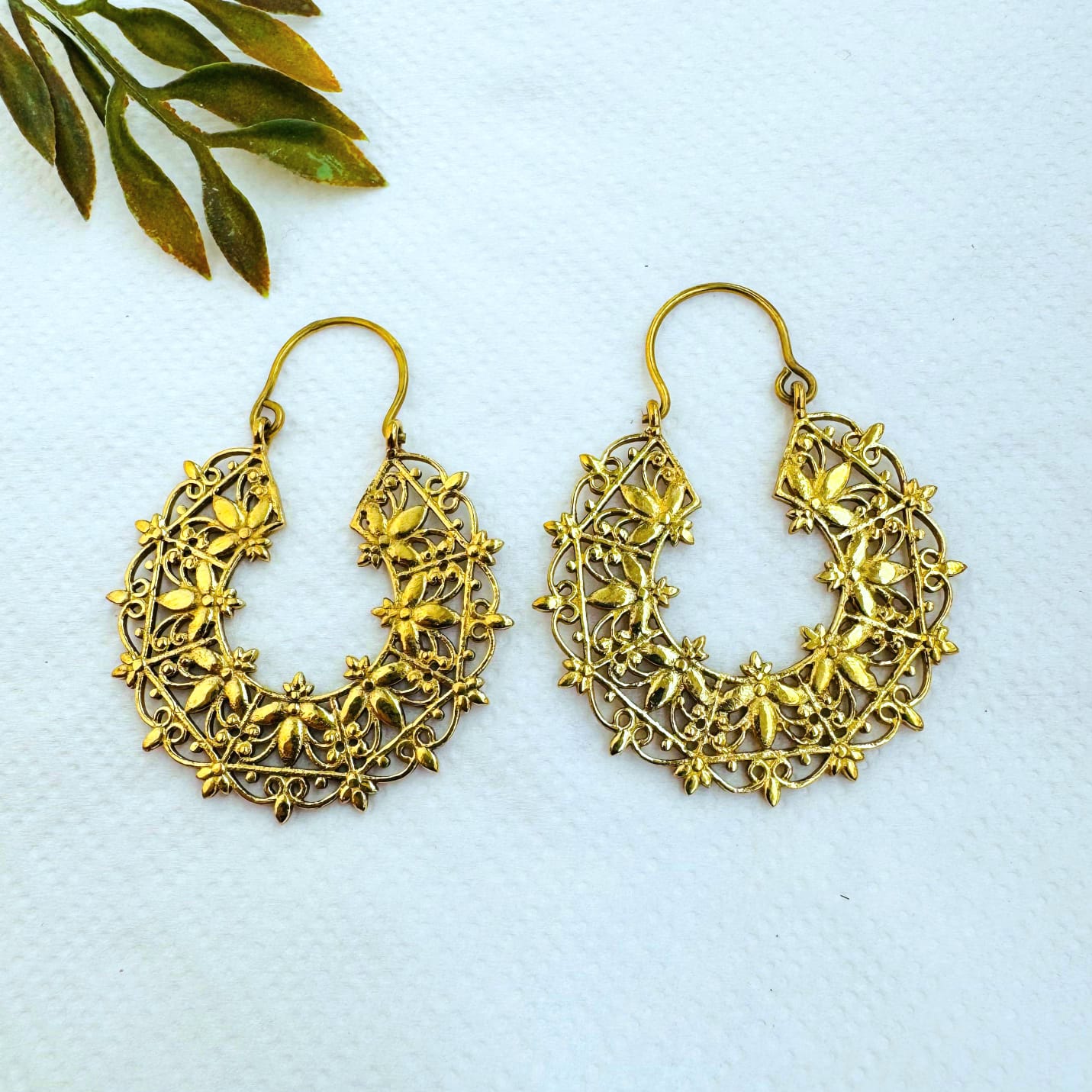 Handcrafted gold plated brass earring featuring an intricate floral vine filigree pattern, inspired by nature and vintage botanical jewelry. Lightweight and perfect for a bold yet elegant look.