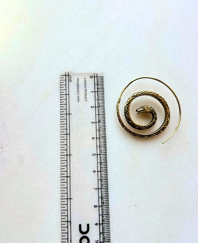 Handcrafted brass spiral earring shaped like a coiled serpent. Symbolizing rebirth and transformation, this unique design combines ancient symbolism with modern artistry.