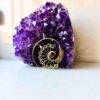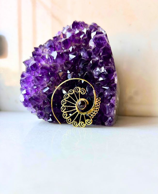 These handcrafted brass earrings showcase a stunning spiral filigree design, inspired by the flow of natural forms and traditional Indian craftsmanship. The intricate coiled pattern radiates outward from a central gemstone, creating a captivating blend of geometry and artistry.