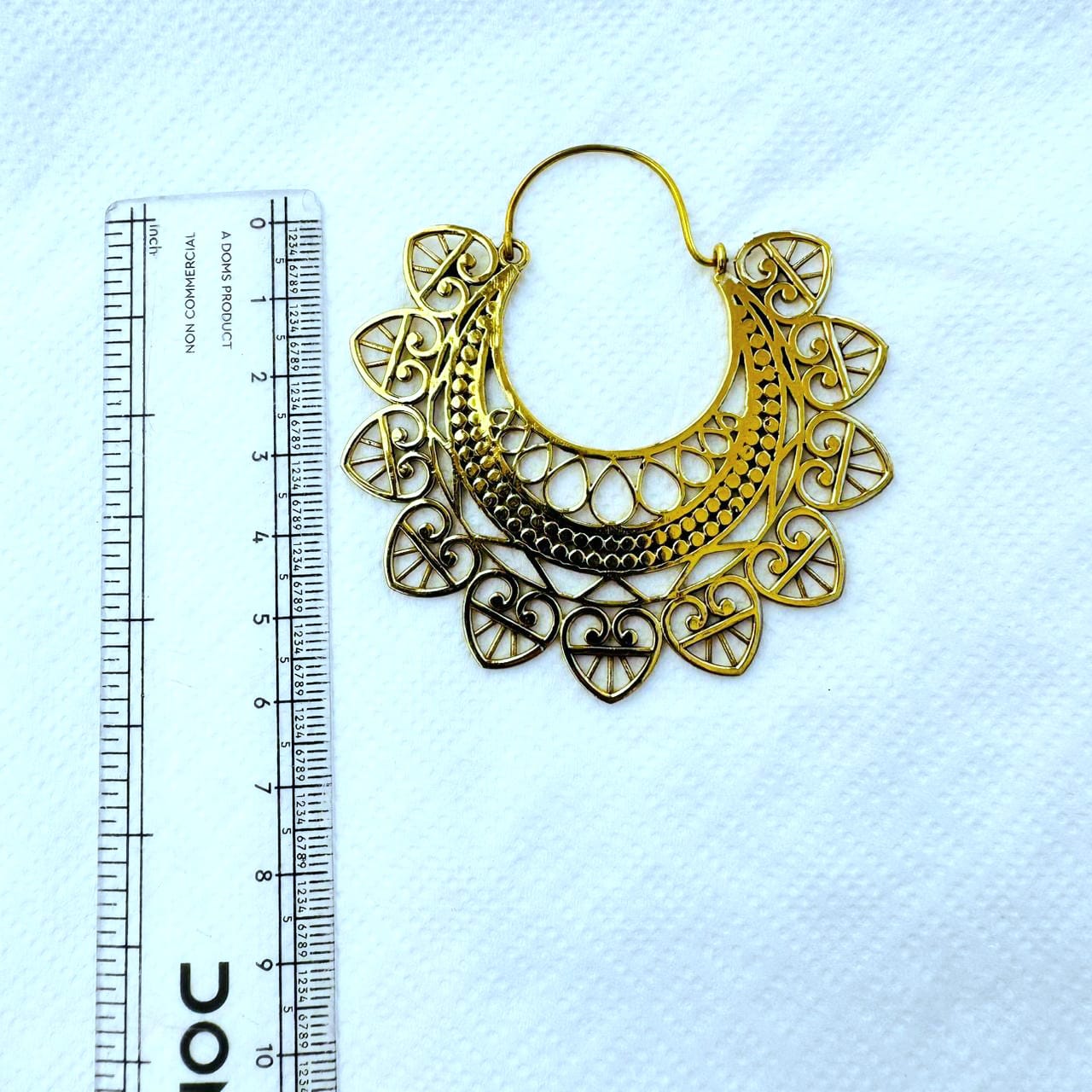 These ornate crescent brass earrings showcase a rich combination of mandala geometry, delicate filigree curls, and layered dot detailing. The crescent silhouette is framed with petal-like motifs, creating a powerful yet feminine statement piece.