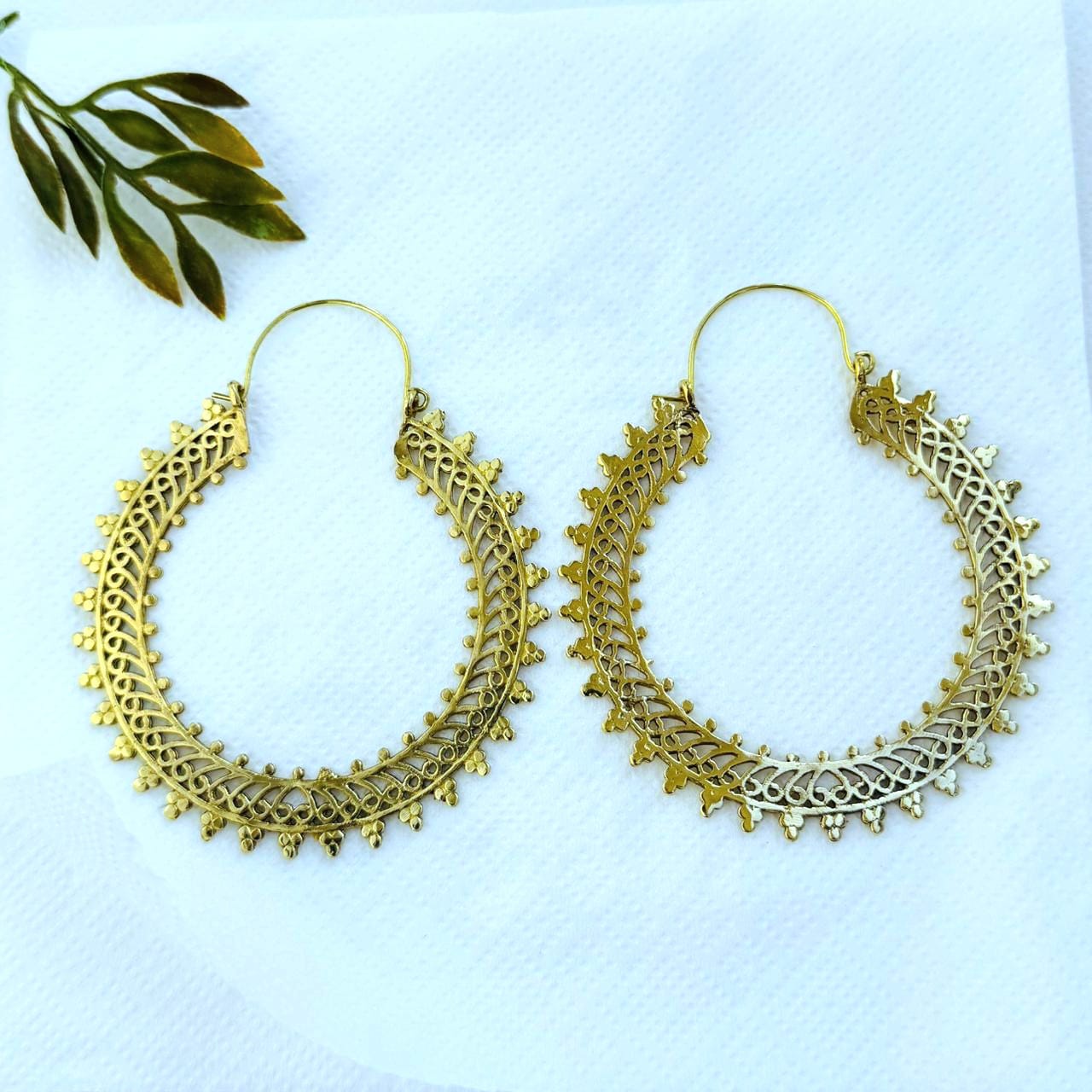 These boho crescent brass earrings feature a beautifully curved silhouette decorated with delicate filigree patterns and tiny dotted accents along the edge. The openwork design keeps them light and comfortable while adding rich texture and ethnic character.