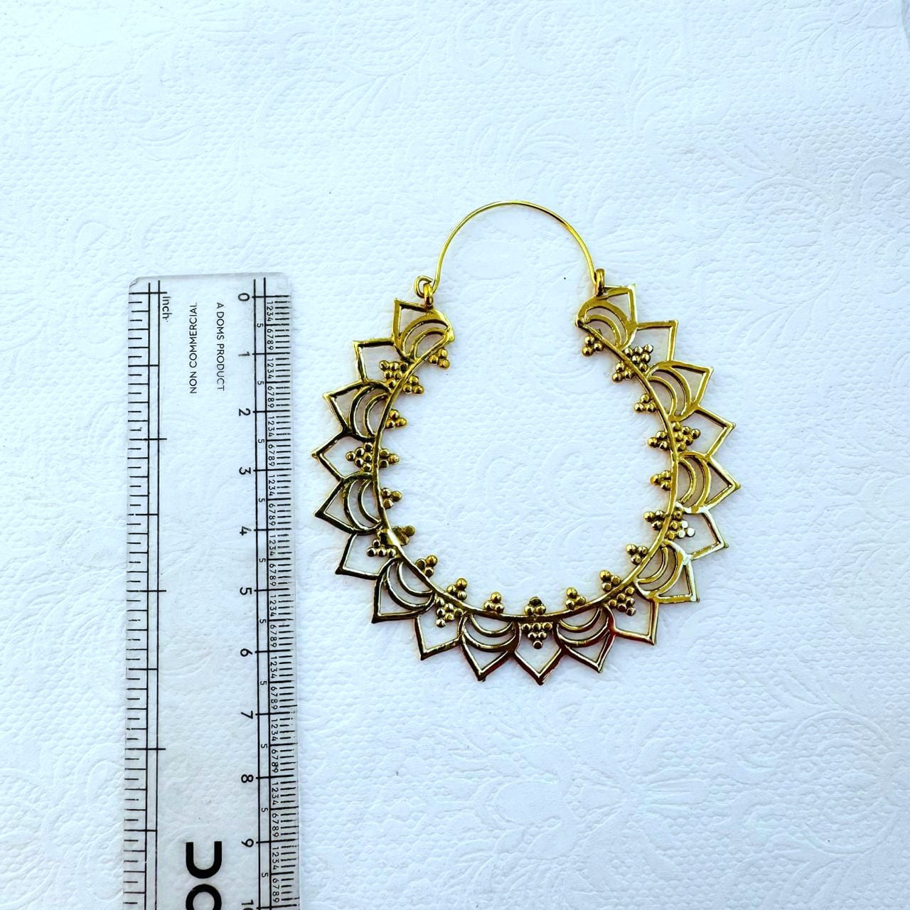 These unique brass earrings feature a graceful hoop base adorned with repeating geometric and lotus-inspired elements, accented with tiny brass bead details along the inner curve. The design creates a rhythmic, architectural look that feels both traditional and contemporary.