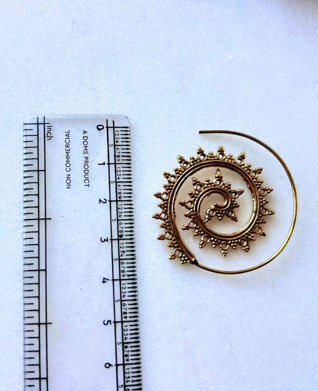 These exquisite brass spiral earrings are a celebration of detailed artistry and cultural elegance. Designed in a sunburst filigree pattern, each earring curls into a graceful spiral, symbolizing growth, energy, and balance. The handcrafted detailing and warm golden finish make them a standout accessory suitable for both everyday wear and special occasions.
