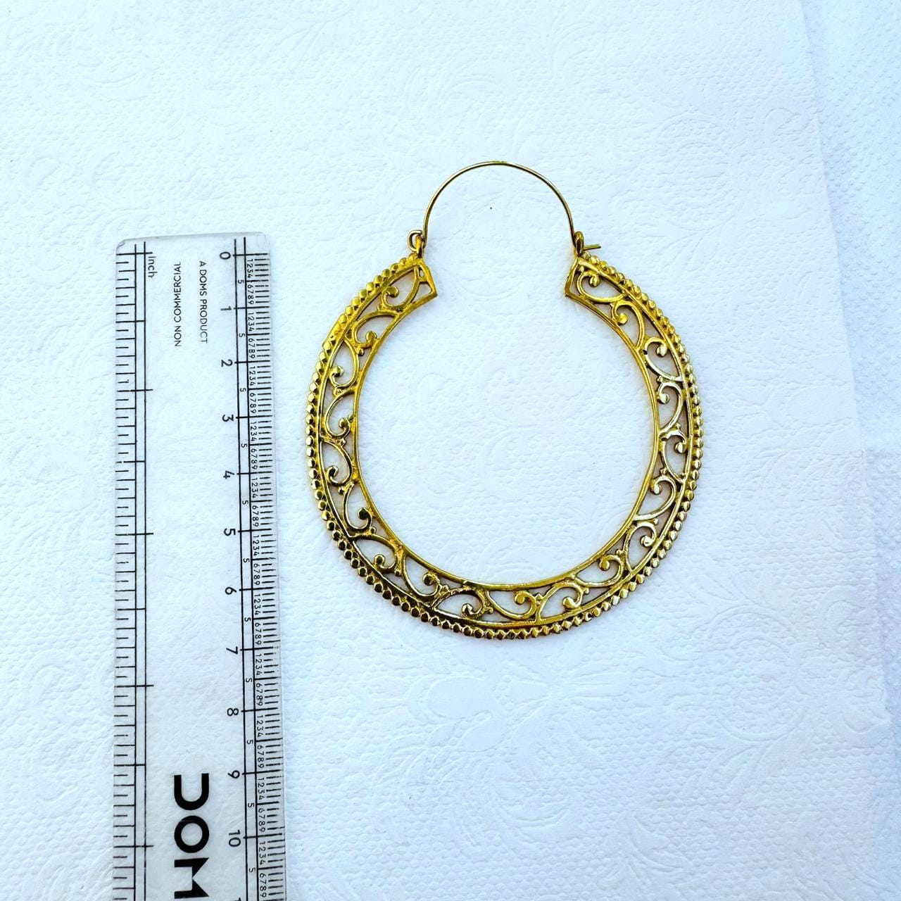 These stunning brass earrings feature a classic hoop silhouette enhanced with intricate filigree scrollwork and a finely detailed border. The openwork design gives them a light, airy feel while showcasing beautiful craftsmanship inspired by traditional and vintage jewelry styles.