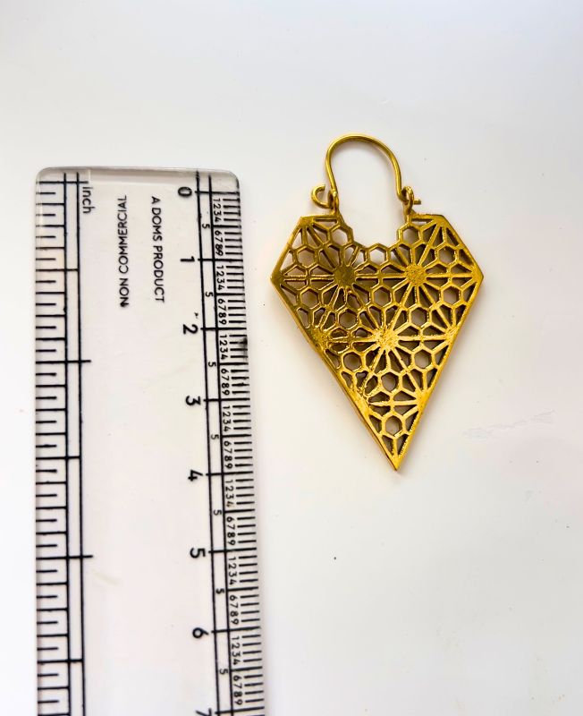 Bold and intricate, these diamond-shaped brass earrings feature a detailed geometric floral pattern. Lightweight yet striking, they bring a modern ethnic flair to any ensemble.