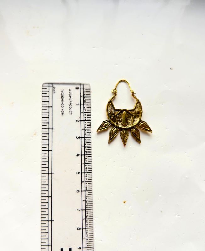 These handcrafted earrings feature a delicate yet bold design inspired by nature and tribal art. The unique petal-shaped hoop curves outward and is adorned with intricate leaf etchings, making them a captivating accessory for any bohemian or tribal jewelry collection.
