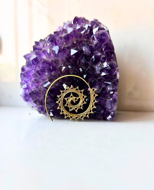 Elegant handcrafted spiral earrings in raw brass featuring ornate tribal filigree details. These earrings combine a bold bohemian statement with timeless brass craftsmanship perfect for free spirits and artisan jewelry lovers.